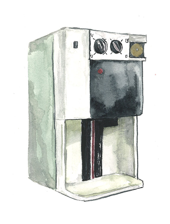 Since the Skotheim lab used a variety of methods and model systems to study cell size, the equipment we used tended to be quite different. The one item that united us all, however, was the humble Coulter counter, a machine that does two things exceedingly well: count cells and measure their volume. I painted a portrait of our resident Coulter counter, alongside its trusted friend, the blue maintenance solution that we all called "blue stuff." These images eventually were made into a Skotheim lab hoodie.